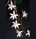 Mounted on cork plaque. Small species native to Madagascar has leathery green leaves that are forked at the tip and have a tessellated pattern overlaid with tiny dark green spots. Flowers are borne on a long pendant spike, and are fragrant at night. They are white, with a long nectar spur. Very attractive plant even out of bloom. Blooming size plants