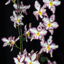 2” pot. Beallara is an intergeneric cross between Brassia, Miltonia, Cochlioda, and Odontoglossum. This variety will bloom with tall spikes of pink-lavender flowers with pronounced white circular markings and a touch of yellow in the center. Mid-size mericlone “seedlings”. [Photo courtesy of The Orchid Works]