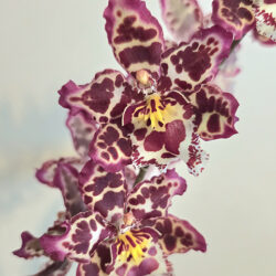 Mounted on cork plaque. Also called equitant oncidiums, Tolumnias are miniature fan-shaped plants native to the Caribbean, where they grow on twigs. Jairak FIrm is a hybrid of several different Tolumnia species, and will bloom with sprays of bright red flowers. When it has finished blooming, don’t cut the spike because it may branch and bloom again. Tolumnias like it relatively warm and bright, with good air circulation and high humidity. The plants we have for sale are near blooming size.