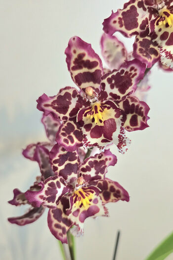 Intergeneric hybrid produces sprays of many colorful cream and pink flowers with prominent dark red markings in interesting patterns. Young mericlone “seedlings”. [Photo courtesy of Jen Selwa]